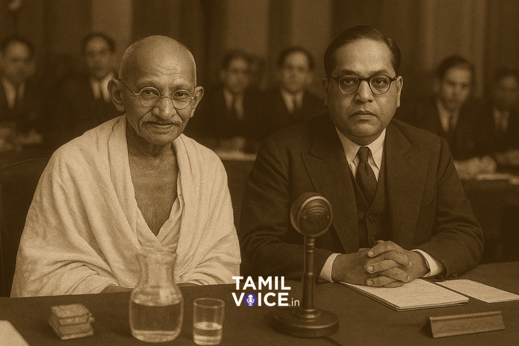 காந்தியும், அம்பேத்கரும் முதன் முதலில் 1931, லண்டன் Round Table Conference-ல் சந்தித்தனர். காந்தியும், அம்பேத்கரும் “தாழ்த்தப்பட்ட மக்களுக்கு உரிமை வழங்க வேண்டும்” என்பதில் ஒரே கருத்தில் இருந்தனர். காந்தி “தாழ்த்தப்பட்டவர்கள் ஹரிஜன்கள் (இறைவனின் மக்கள்)” என்று அழைத்தார். கோவில்களில் நுழைவு, கல்வி, குடிநீர் உரிமை போன்றவற்றில் அவர்களின் முன்னேற்றத்திற்காகப் பணிபுரிந்தார். அம்பேத்கரும் இதை வரவேற்றார், ஆனால் “சாதி வேரோடு அழிய வேண்டும்” என்ற தீவிர நிலைப்பாட்டில் இருந்தார் அம்பேத்கர், தாழ்த்தப்பட்ட மக்களுக்கு தனி தேர்தல் தொகுதிகள் (Separate Electorates) வேண்டும் என்றார். காந்தி அதற்கு எதிர்ப்பு தெரிவித்தார். காரணம்: “இந்தியர்கள் அனைவரும் ஒன்றாக சுதந்திரப் போராட்டத்தில் ஈடுபட வேண்டும்; பிரிவினை ஏற்படுத்தக் கூடாது” என்றார். (1932) பிரிட்டிஷ் அரசு அம்பேத்கரின் கோரிக்கையை ஏற்று தாழ்த்தப்பட்ட மக்களுக்கு தனி தொகுதி அளிக்க முடிவு செய்தது. இதற்கு எதிர்ப்பு தெரிவிக்க காந்தி யெரவடா சிறையில் உண்ணாவிரதம் ஆரம்பித்தார். அம்பேத்கர் மற்றும் காங்கிரஸ் தலைவர்களுடன் பேச்சுவார்த்தை நடைபெற்றது. முடிவாக பூனா உடன்படிக்கைகையெழுத்திடப்பட்டது. தனித் தொகுதி இல்லாமல், பொது தொகுதிகளில் ஒதுக்கீடு (Reservation) வழங்கப்பட்டது.