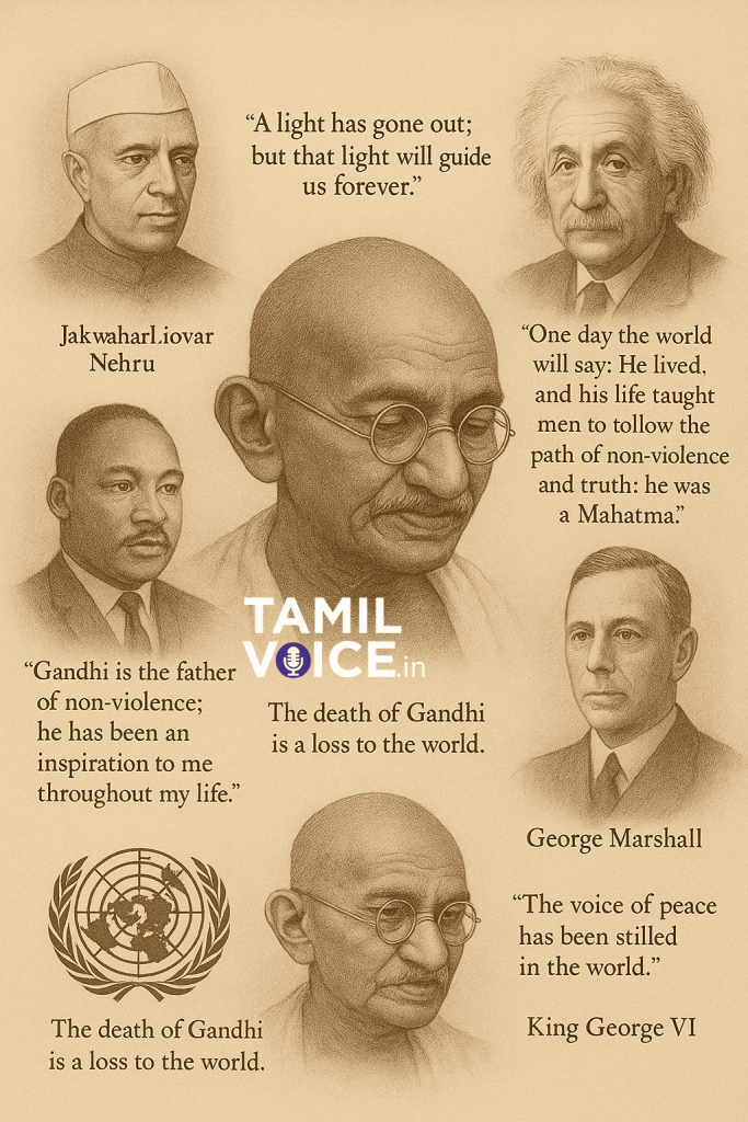 காந்தியின் மரணம் இந்தியாவையே, உலகையே அதிர்ச்சியில் ஆழ்த்தியது. பண்டிட் ஜவஹர்லால் நேரு அப்போது நாடு முழுவதும் உரையாற்றி, “ஒளி மறைந்துவிட்டது; ஆனால் அந்த ஒளி என்றென்றும் நம்மை வழிநடத்தும்” என்றார். “மக்கள் எதிர்காலத்தில் கூறுவார்கள்: ஒருவன் ஒருகாலத்தில் வாழ்ந்தான், அஹிம்சையாலும் உண்மையாலும் மக்களை வழிநடத்தினான்; அவனே காந்தி” என்று ஆல்பர்ட் ஐன்ஸ்டீன் எழுதினார். “காந்தி தான் அஹிம்சையின் தந்தை; என் வாழ்நாள் முழுவதும் அவர் எனக்கு ஊக்கமாக இருக்கிறார்” என்று மார்டின் லூதர் கிங் ஜூனியர் (அமெரிக்கா) கூறினார். ஜார்ஜ் மார்ஷல் (அமெரிக்க வெளியுறவு செயலர்) “காந்தியின் மரணம் உலகத்திற்கே மிகப் பெரிய இழப்பு” என்றார். கிங் ஜார்ஜ் VI (இங்கிலாந்து மன்னர்) “அமைதிக்கான குரல் உலகத்திலிருந்து மறைந்துவிட்டது” என்று வருந்தினார். யு.என்.ஓ (United Nations Organization) காந்தி மரணத்துக்கு இரங்கல் தெரிவித்தது மட்டுமல்லாமல், அவரது நினைவாக ஜனவரி 30-ஐ “மார்ட்டியர்ஸ் டே” என்று கடைப்பிடிக்க அறிவுறுத்தியது.