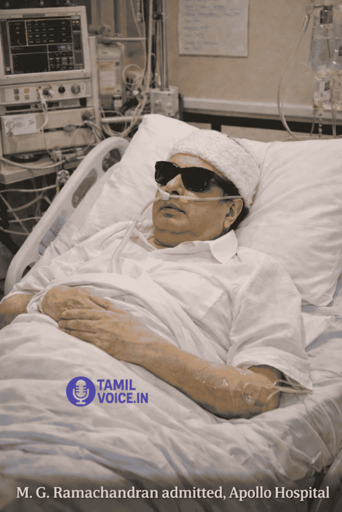 5 அக்டோபர் 1984 அன்று நள்ளிரவு எம்ஜிஆர்க்கு உடல்நிலை பாதிக்கப்பட்டு சென்னை அப்பல்லோ மருத்துவமனையில் அனுமதிக்கப்பட்டார். எம்ஜிஆரின் உடல்நிலை பற்றி பல வதந்திகள் தமிழ்நாடு முழுவதும் பரவத் தொடங்கியது. மக்கள் கூட்டம் கூட்டமாக சென்னை நோக்கி வரத் தொடங்கினர். எம்ஜிஆர் உயிர் பிழைக்க உண்ணாவிரதங்கள், வேண்டுதல்கள், யாகங்கள், பிரார்த்தனைகள் நாடு முழுவதும் நடத்தப்பட்டது. சிலர் மொட்டை அடித்துக் கொண்டனர். பத்துக்கும் மேற்பட்டவர்கள் தீக்குளித்து இறந்ததாக செய்திகள் வெளியாகின. எம்.ஜி.ஆருக்காக பிரார்த்தனை செய்வதாக கருணாநிதி அறிவித்தார். எம்ஜிஆரை காண ஜானகி நெடுஞ்செழியன் போன்ற ஒரு சிலருக்கு மட்டுமே மருத்துவமனையில் அனுமதி கொடுக்கப்பட்டது. ஜெயலலிதா சென்று பார்க்க அனுமதி மறுக்கப்பட்டது. காரணம் எம்ஜிஆர் உடல்நிலை சரியில்லாததற்கு சில நாட்களுக்கு முன்புதான் அவருடைய கொள்கை பரப்பு செயலாளர் பதவி பறிக்கப்பட்டிருந்தது. எம்ஜிஆரை பார்க்க இந்திரா காந்தி நேரில் வந்தார். எம்ஜிஆருக்கு சிகிச்சை அளிக்க அமெரிக்க செல்ல ஏற்பாடுகள் தயாராயிண. தமிழக நிர்வாகத்தை நெடுஞ்செழியனும், கட்சி நிர்வாகத்தை ஆர்.எம்.வீராப்பனும் கவனிப்பார்கள் என்று அறிவிக்கப்பட்டது.